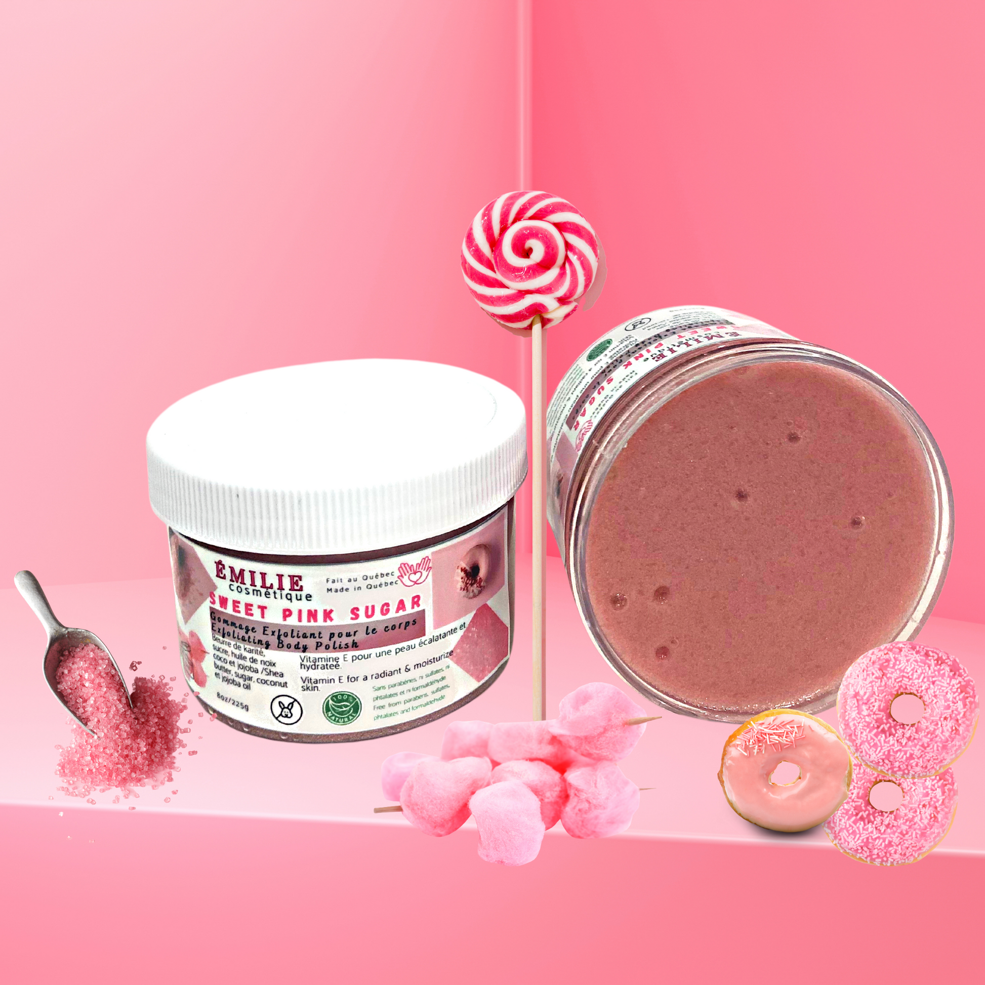 Our mind blower, Sweet Pink Sugar Body Polish, which is a 2-in-1 cleanser and exfoliator, is a blend of natural coconut cream foaming agent and very fine sugars which polishes your skin leaving it clean, refresh, silky smooth and hydrated with Shea Butter and a mixture of organic coconut oil,  Jojoba oil and Grapeseed Oil.